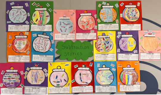 In Foundation, students have been learning about solving subtraction stories using the strategies of taking away and crossing out. We made our own subtraction story and matched it with a number sentence in our candy jar’ craft activity. Students got to pick how many lollies fell out of their jar and found out how many lollies were remaining. Foundation students loved this activity!