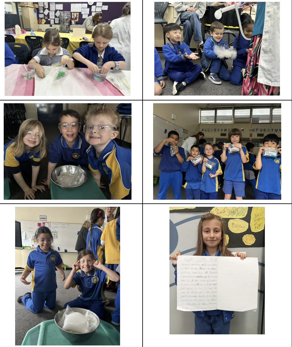The Grade Ones participated in a Super Science event to complement our inquiry unit Stimulating Science. They mixed, tested and hypothesised while exploring exciting hands-on experiments, from catching dry ice fog to making slime and giant bubbles! Students also rotated through stations where they made slime and worked in groups to make exploding bags.