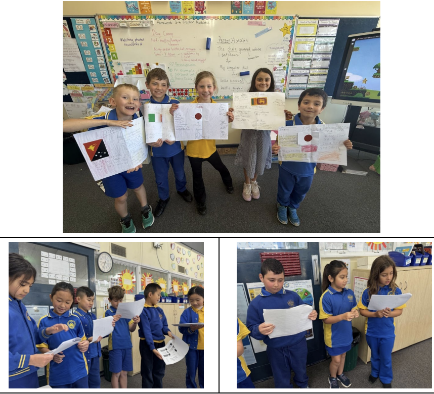 Grade 2 students have been developing their reading fluency and expression through reader’s theatre and performing their plays for an audience. In Writing, they have been planning, researching and creating information reports about a country of their choice as well as a community helper.