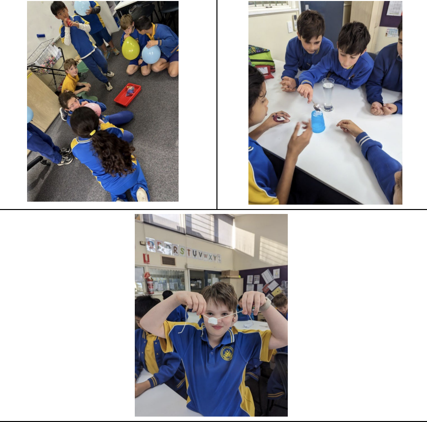 In Foundation, students have continued to explore materials and their properties through a range of different activities. One favourite activity for students was identifying objects that are magnetic by using our large classroom magnetic to see which items they could collect. In Grades 1/2, students explored how to strengthen paper by folding, rolling and layering it to build strong paper bridges. They tested their predictions by seeing how many blocks each design could hold without sagging. This helped them understand how the shape of materials can affect their strength. Students in Grades 3/4, investigated the properties of gases through a range of experiments using balloons, bubbles, syringes and air sprays. They learned that gases are invisible, take up space, and can be compressed. These activities helped them see how gases behave differently from solids and liquids in everyday life. In Grade 5/6 we have been learning about particles and their behaviour. We've explored how particles move differently in solids, liquids, and gases, and how this movement changes during phase changes. One highlight was conducting the ice rope experiment, where we discovered that salt lowers the freezing point of water which was demonstrated as the salt allowed the string to become embedded in the ice cube.