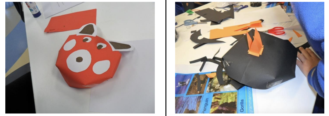 This week, the Grade 5/6 students started making paper collage masks of endangered animals. First, they drew a sketch of their chosen animal. Then, they made the base of the mask using coloured cardstock. After that, they added facial features with coloured paper, layering different shapes and sizes to make the masks more detailed and interesting.