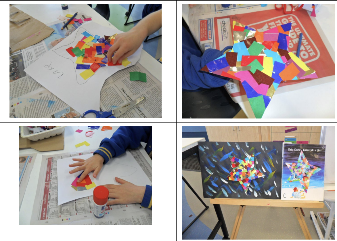 Term 3 has started with excitement as the Foundation to Grade 2 students begin a semester of Visual Arts. This fortnight, students in Foundation have been drawing their family using markers behind a rainbow watercolour background. Grade 1 students listened to the story ‘Draw Me a Star’ by Eric Carle and created a striking background of quick brushstrokes and a coloured paper collage of a star. Meanwhile, the Grade 2s listened to the story ‘Papa, Please Get Me the Moon’ also by the author and illustrator Eric Carle. Students have made a mixed media art piece using acrylic paints for the background, matchsticks for a ladder, wallpaper or fabric to make a moon and a photo of themselves climbing a ladder reaching for the moon. Here are some examples of Grade 1 students making a star collage.